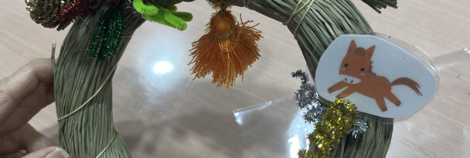 町田市玉川学園の花教室フラワーwizです。 デイサービスで正月飾りを皆さんと作りました^ ^ イグサの香りを楽しみながら、モールで松竹梅などの飾りを作り飾っていきました。橙を付けて 手作りの馬を付けて 皆さん ご自分で作った作品に満足の笑顔でした。また 来年 ✌︎^ ^